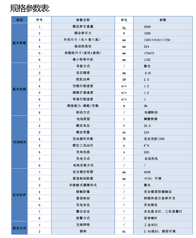 功能特性: ➢ 1000Kg-15000Kg室内后牵引型第4代AGV ➢ 采用3D激光SLAM导航更精准,误差±10mm ➢ 专用车体更耐用,承载强,行驶稳,通过性好 ➢ 多重安全保护,四激光避障雷达,四急停开关 ➢ 人工/自动驾驶自由切换,操作灵活舒适便捷 ➢ 可非标定制,适应多种应用环境