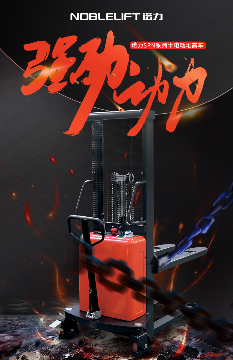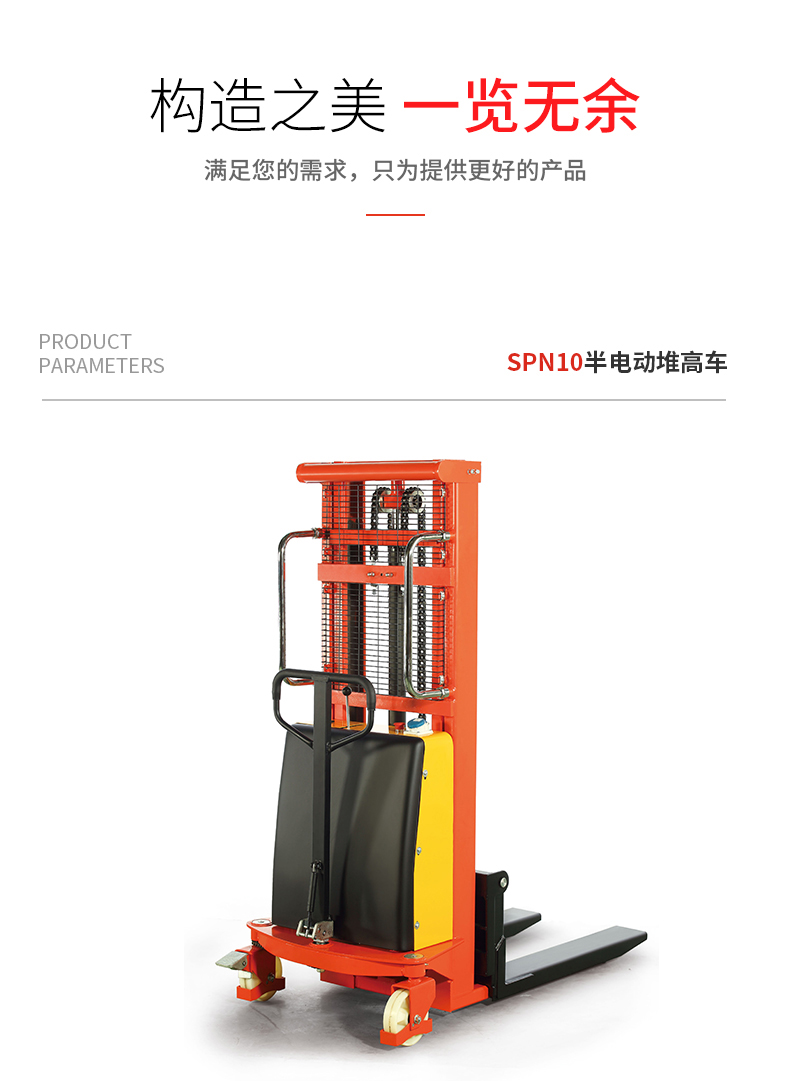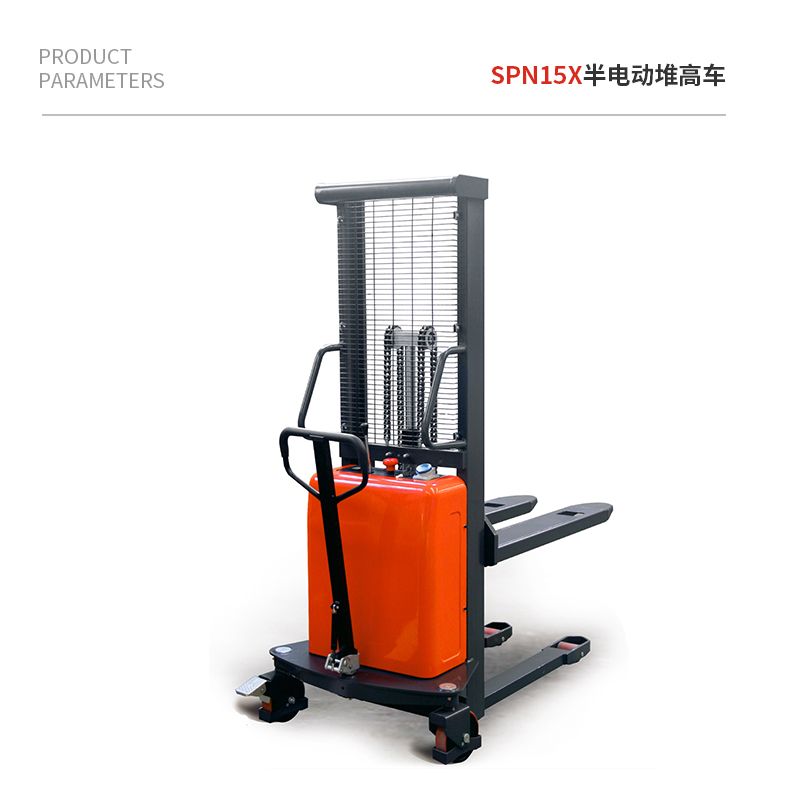 SPN系列半动堆高车式段距离搬运不行车辆,邮箱载荷可达1000kg/1500kg,提升高度最大可达3500mm。特别适合在位置收到限制的使用场合,尤其在窄巷道中表现更为出色