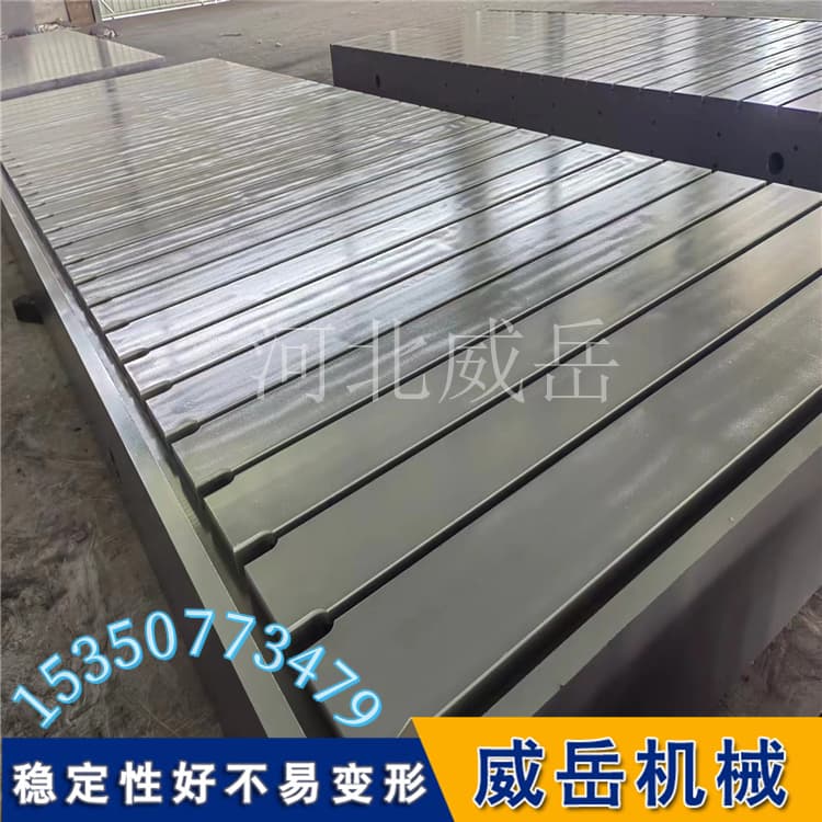 第三招:规范安装+日常养护,杜绝二次变形。复原后的铸铁平台若缺乏科学维护,易再次变形。需做好三点:一是规范安装,选用10.9级强度地脚螺栓,按“四点找平、六点支撑”原则固定,水平度控制在0.03mm/m以内,避免地面沉降导致变形;二是合理使用,承载不超过额定载荷的80%,避免工件拖拽、碰撞台面,高温工件需垫隔热板(厚度≥20mm);三是定期养护,每3个月清洁台面(用软布+中性清洁剂,禁用钢丝球、强酸强碱),每6个月用激光干涉仪校准精度,长期闲置时需覆盖防尘罩,涂抹防锈油(台面)与润滑脂(T型槽)。某科研实验室通过这套养护方案,让复原后的铸铁平台稳定运行5年未再变形,精度始终保持在00级标准。