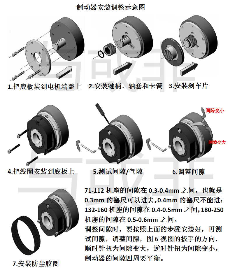 7.安装好制动器,需先通电测试制动器的能否正常吸合释放,再和电机等其他设备一起测试,正常的制动器吸合和释放有清脆的‘啪’的一声;