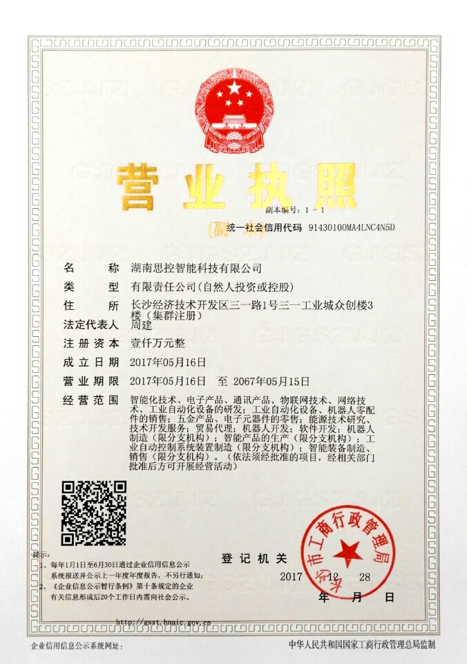 | 公司名称: | 湖南思控智能科技有限公司 | 注册地址: | 长沙市经济技术开发区三一路三一工业城众创楼3楼 |