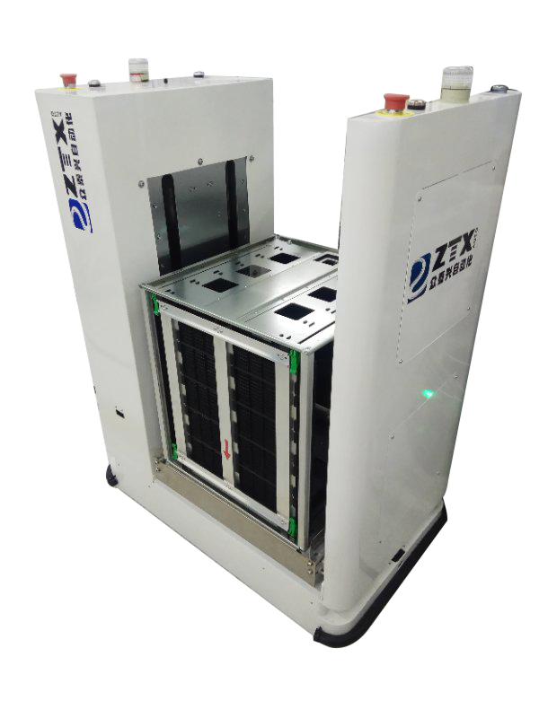 SMT专用AGV,用来搬运Magazine料框,并输送到指定的上板机或下板机上面,实现空和满Magazine料框的交替搬运。其与设备对接时采用2次定位,可保证5mm内的设备对接精度。