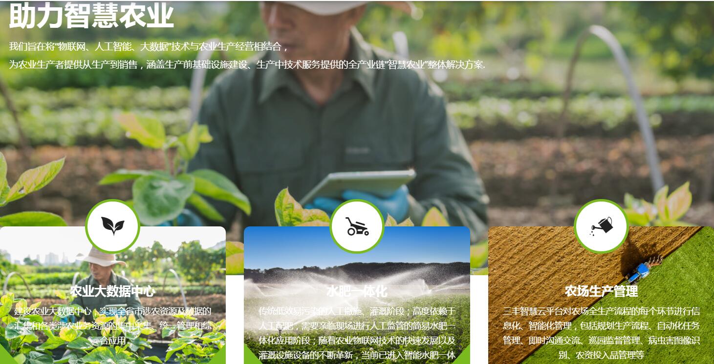 南京三丰智能科技有限公司,作为智慧农业整体解决方案服务商,服务内容面向不同对象,有智慧农业云平台、智慧农业规划设计、智慧生产管理工程建设、安全追溯。 秉承创新、诚信、共享、分享的企业文化。脚踏实地,打造成为国内一流的智慧农业整体解决方案服务商。