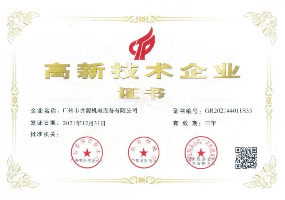 近日,广州市井源机电设备有限公司收到由广东省科学技术厅、广东省财政厅、国家税务总局广东省税务局颁发的高新技术企业证书。井源机电继2012年以来,再次获得高企认证复审通过,对得到政府单位及行业客户对公司产品及技术的高度认可,倍感荣幸。