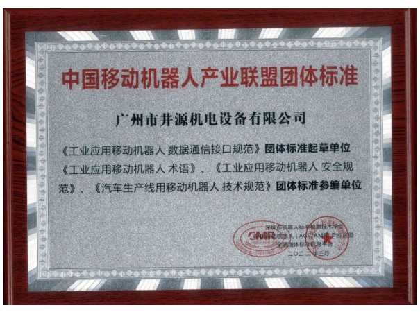 井源机电作为中国移动机器人(AGV/AMR)产业联盟理事单位,一直全力支持并配合联盟活动。2019年起,联盟为推动产业发展,成立标准管理委员会,并发布一系列团体标准,井源机电作为国内具有一定AGV研发制造水平的企业,积极参与了其中4项团体标准的起草、参编工作。