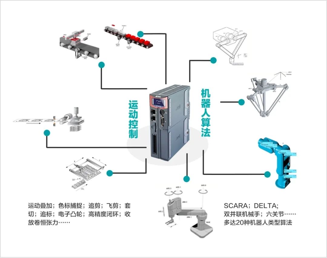 Motion Perfect拥有:运动叠加、色标捕捉、追剪、飞剪、套切、追标、电子凸轮、高精度闭环、收放卷恒张力等算法。同时拥有:SCARA、DELTA、双并联机械手、六关节等,多达20种机器人类型算法。