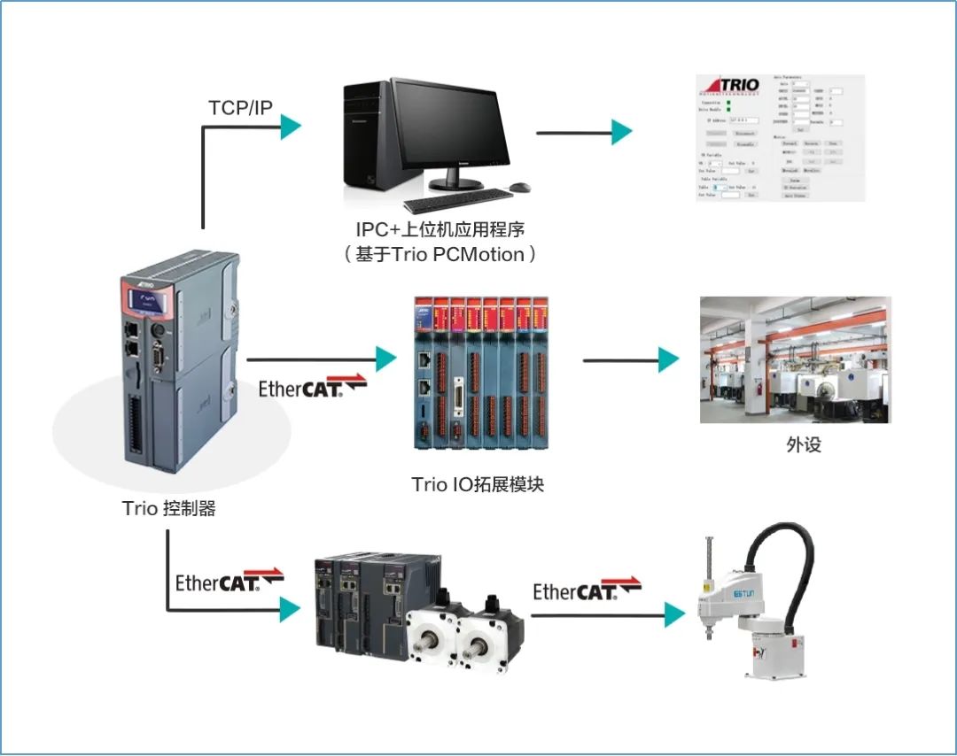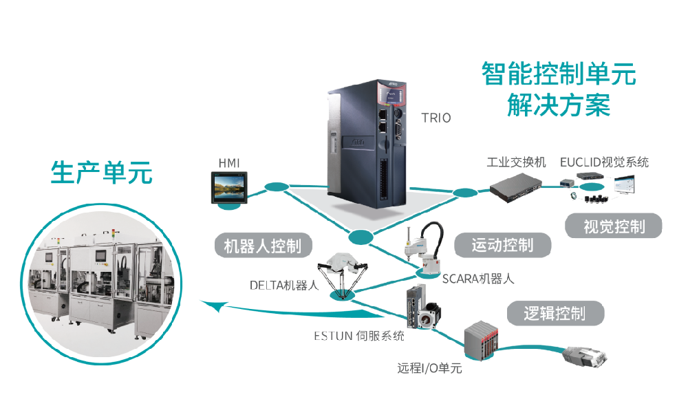 智能控制单元是以埃斯顿全系列产品为基础。以TRIO强大的运动控制器为核心,将埃斯顿机器人,伺服系统,视觉系统集成到一起,只需要一个TRIO控制器,即可完成机器人控制,外部轴控制,逻辑控制,依托TRIO Motion Perfect软件平台实现信息化、数字化互联互通。为您短时间、高效率构建一套由单机到产线的智能化完整解决方案。
