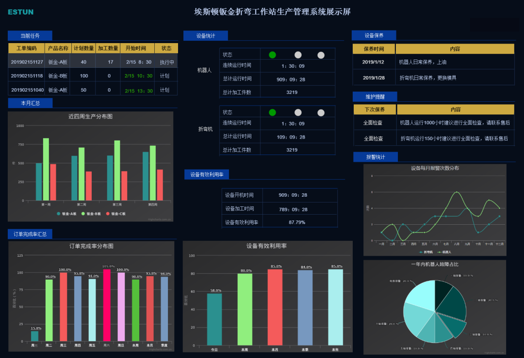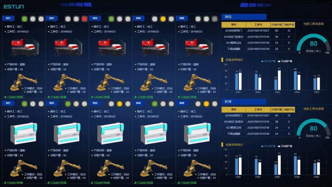 在埃斯顿钣金自动化、数字化产线中,埃斯顿钣金自动化中控系统将加工指令自动下发给各个设备,同时采集线体运行和产品生产数据,实现精益化生产。