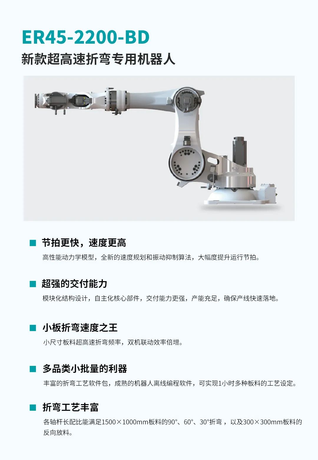 针对行业多品类小批量的生产场景,埃斯顿相继推出ER130-2865-BD大负载折弯专用机器人。2022年,重磅发布超高速折弯专用机器人ER45-2200-BD,为小型板料快速折弯,多品类切换提供更具竞争力的解决方案。