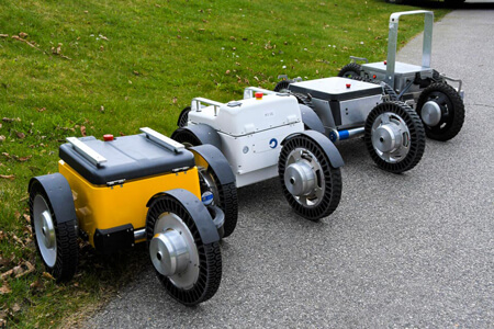 这让 Mads 想到发明一种新型轮架并为其申请专利,该轮架可用于新型移动车辆——它应该非常灵活和机动,转向精确且紧凑。这个想法是优越的,由一个带有前后轮的轮架和两个侧轮组成——前后轮同步反方向转动,允许原地360°转向,方向精度高. 此外,还开发了一种新型悬架系统并与轮架集成,具有可变的灵活性,允许攀爬更大的路缘石,并且具有很强的地形适应性。