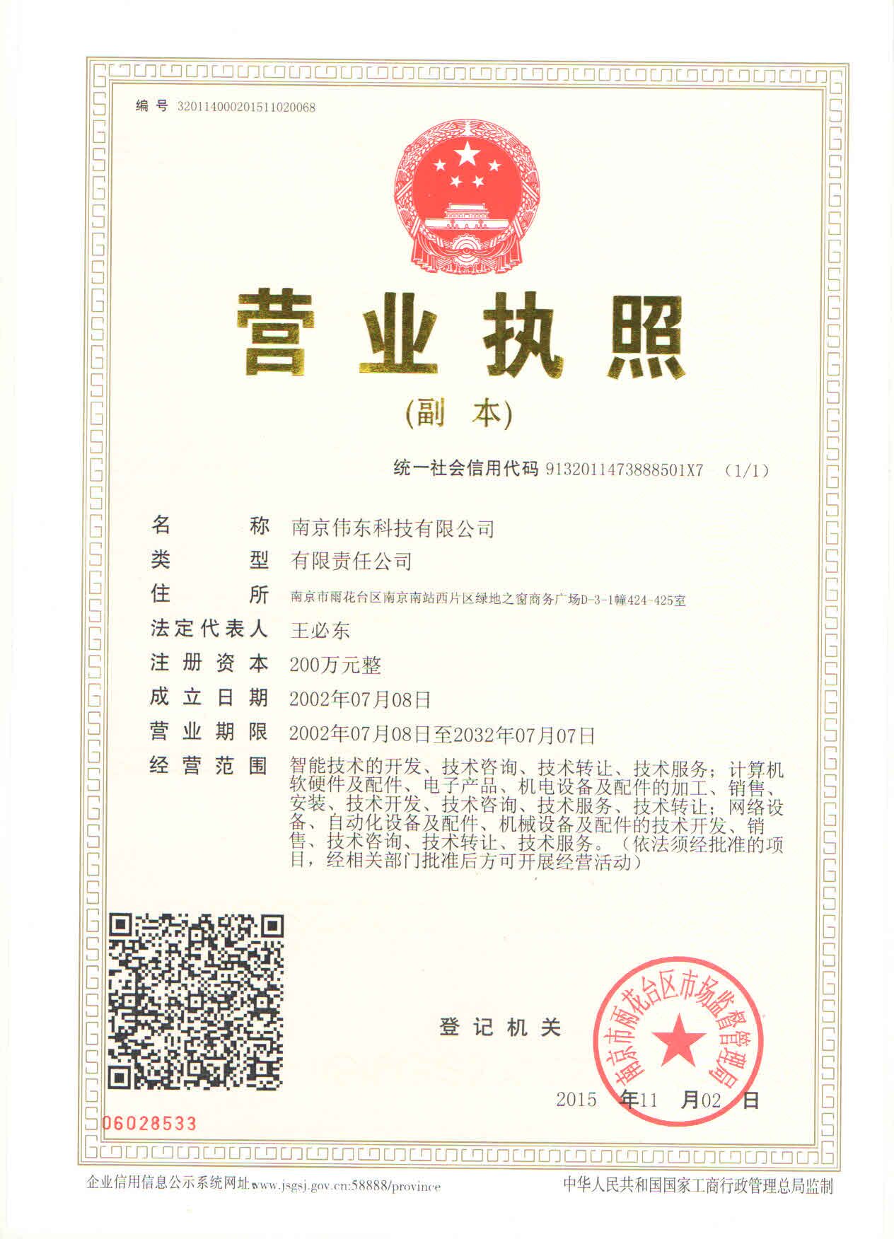 | 营业期限: | 2002-07-08 ~ 2032-07-07 | 年检时间: | 2015-12-02 |