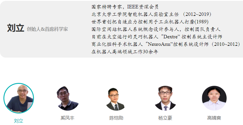 创始人国家特聘专家刘立先生自2012年回国,历任航天科技五院首席科学家、北京大学智能机器人实验室主任,国际首次提出“机器人智能”,是国内外知名太空臂专家,2017年8月,在世界机器人大会中展出了“全球第一台具备力交互功能的双臂机器人”,核心团队拥有30多年人工智能核心算法与机器人控制经验。