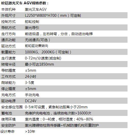 深圳激光叉车agv小车制造厂家|工业激光搬运机器人价格 激光导引叉车AGV是深圳市欧铠机器人有限公司历经数载精心研制的一款AGV产品。激光叉车AGV的成功问世,标志着我司欧铠机器人在激光 AGV领域拥有独一无二的技术优势。它由车体、车载控制器、行走和转向驱动单元、激光查找扫描器、激光安全保护装置、传感器等构成。激光扫描与保护装置采 用的是同步查找技术,激光扫描仪自行探测场地形、在其内部工控 机中智能显现地图,从而可以准确查找AGV车辆运行位置,减少运行路线,提高工作效率。