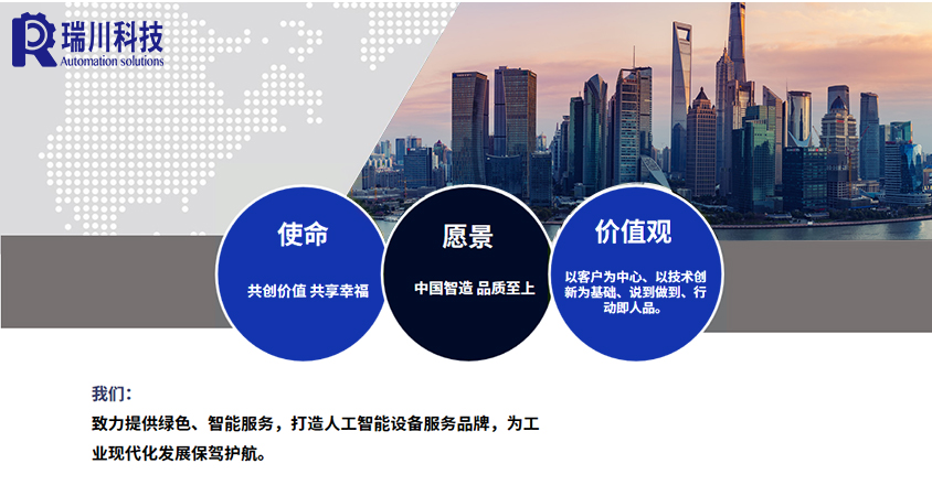 公司以科技推动产业发展,品牌提高生活品质为使命,致力成为同行业具有影响力和竞争力的高技术公司,不断将机器人及自动化装备研发成果转化为生产力,探索和总结适合企业自身发展特点的管理模式和方法,培育和构建智能装备在不同领域应用。创造客户和社会价值,从而实现自身的价值,浙江瑞川愿与热爱机器人自动化事业的朋友们一同为中国机器人事业发展共同奋斗!