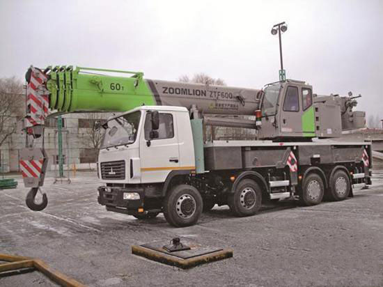 - 相对于国内市场的同吨位产品,中联重科ZTF600通用底盘汽车起重机有三大独家技术亮点: 一是采用了辐射式支腿,能实现360度全方位作业,整机长度短、布置紧凑、转弯半径小、机动性良好; 二是采用了5节U型主臂,全伸长度为40.5m,配备两节副臂,全伸长度为16m,包含了0°、15°、30°多种安装角度; 三是配备了作业区域智能定义系统,操纵人员可以根据自身需求设定作业区域,并通过电脑屏幕予以显示,当超出安全作业范围时,电脑会自动报警。
