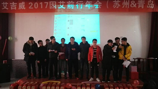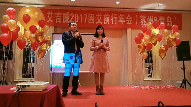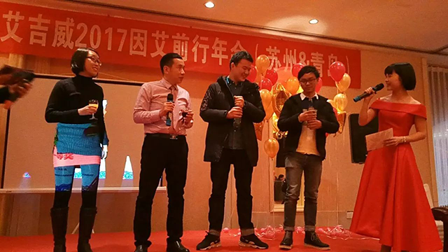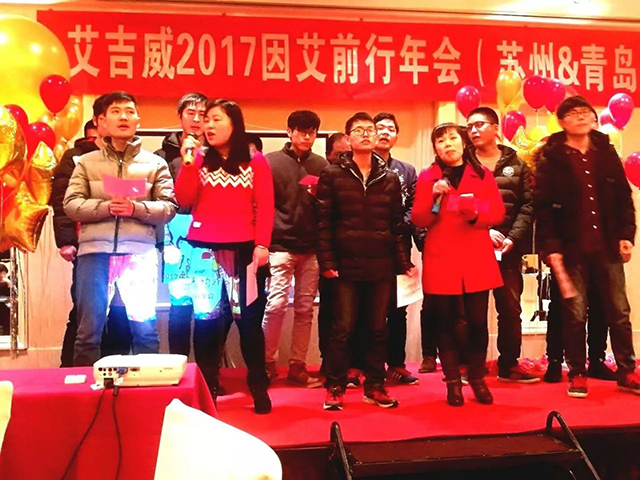为感谢公司全体员工的勤奋努力,答谢社会各界人士的支持与厚爱,1月28日,在新春佳节即将来临之际,2017年艾吉威“因艾前行 共创未来”主题年会分别在苏州和青岛两地同时举行。艾吉威全体员工及家属和来自各地的客户、股东、合作伙伴共聚一堂,举杯同庆,把酒言欢,共赏庆典。我们一起分享2017的收获,畅谈2018的梦想。