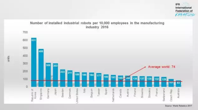 韩国,工业机器人密度全球排名第一。这个数据从2010年保持至今,其机器人密度(631台/万人 )比2015年的531个数字有了明显的增长,已超过全球平均水平的8倍,这种高增长率依赖于韩国制造业新装机器人数量,尤其是在3C和汽车行业。