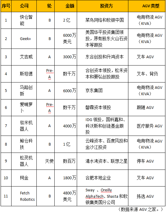 2017年AGV行业融资汇总表