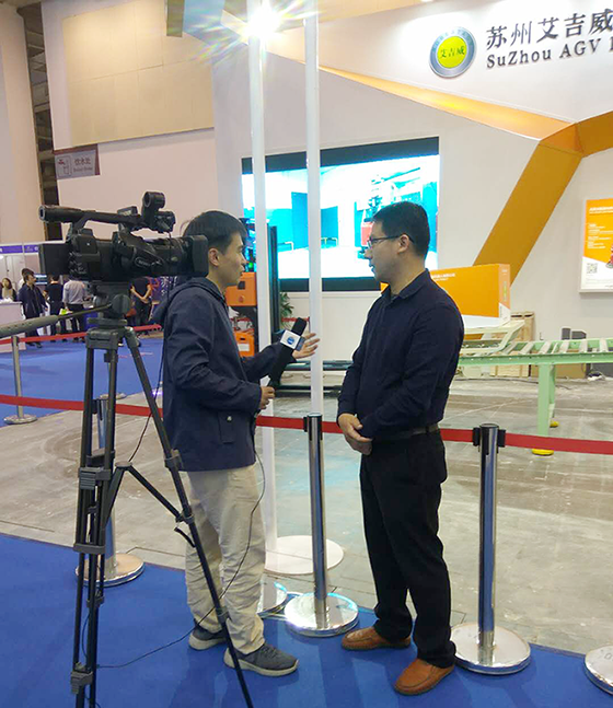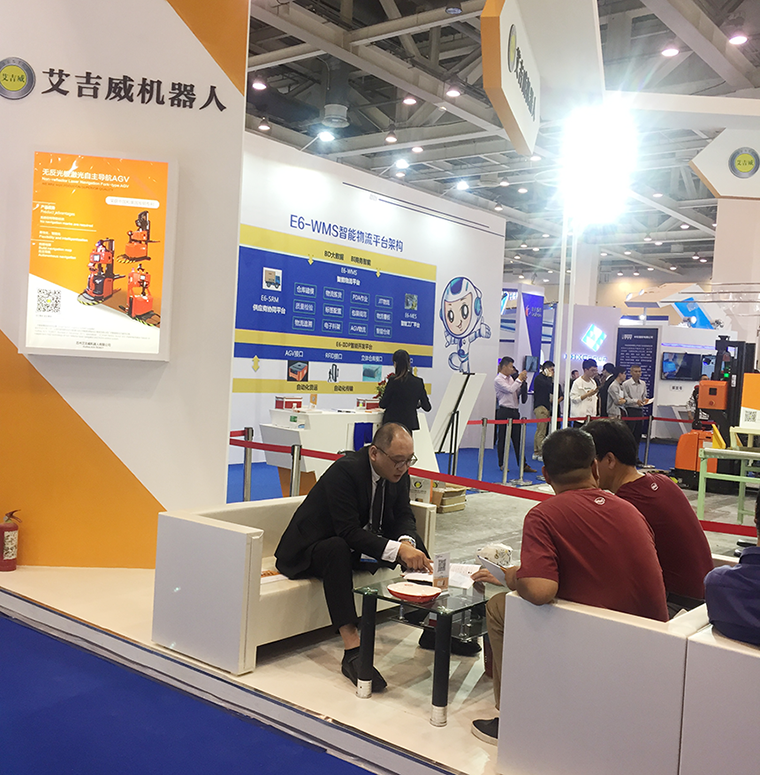 展会现场艾吉威接待人员热情的解说着:“艾吉威作为无反光板激光叉车AGV的先行者,自主研发“无反光板激光自主导航技术”,拥有美国和国家发明专利,无反光激光自主导航AGV——实现了无需安装反光板即可达成AGV小车定位、避障。