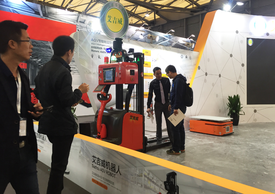由于现场参观人较多,更有意向客户直接进入艾吉威展区详细了解,无标识激光叉车AGV。