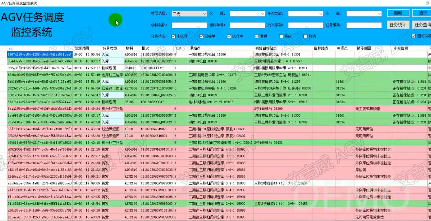 订单信息,显示当前正在执行的任务,各小车的输送物料执行情况,以及各订单开始及结束时间。