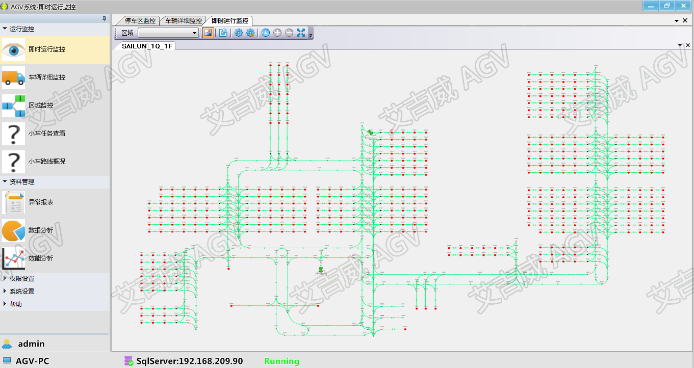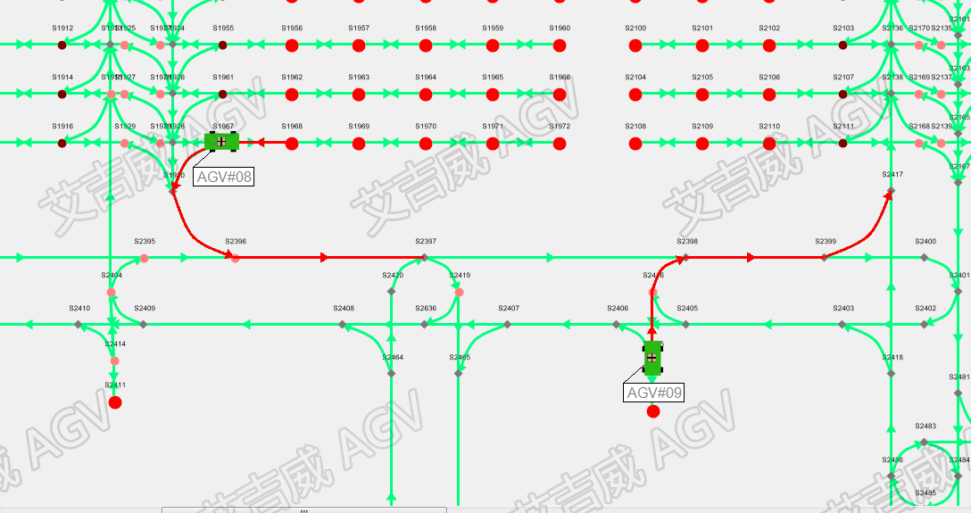 车辆运行监控界面,可显示各AGV的位置状态、任务执行信息等。