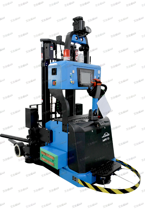 无标识激光前移式叉车AGV,配置可折叠站板及护臂,可以在狭窄的通道内灵活地进行存取作业,用于仓储和生产线上的物料自动搬运堆垛。