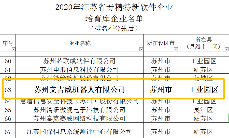 经过江苏省经济和信息化委员会评定,艾吉威凭借先进的AGV导航技术、成熟的无人仓运解决方案和优秀的市场表现,成功进入江苏省“专精特新软件企业培育库企业”名单。