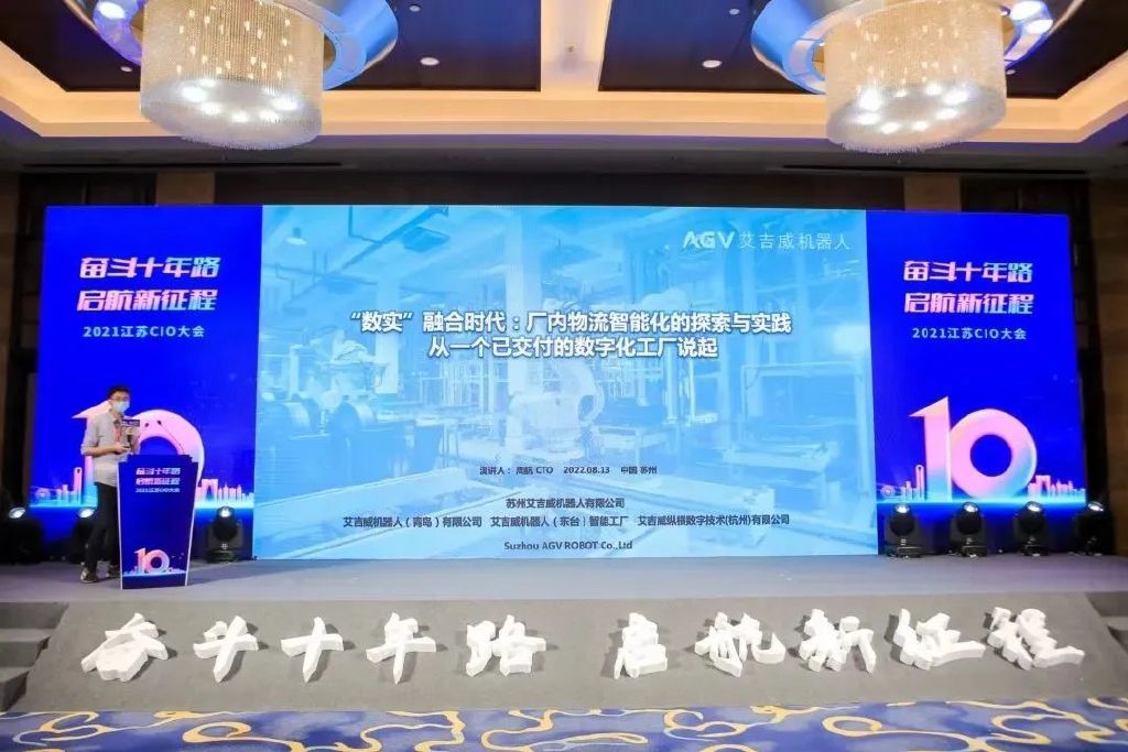 作为江苏移动机器人&数字工厂解决方案的高新技术企业,艾吉威机器人受邀出席大会。在分享环节,艾吉威机器人副CTO周航进行《“数实”融合时代:厂内物流智能化的探索与实践》的演讲,分享和探讨制造企业所关注的数字化转型中亟需解决的痛点和创新应用案例,为工业企业数字化升级提供新方向、新思路。