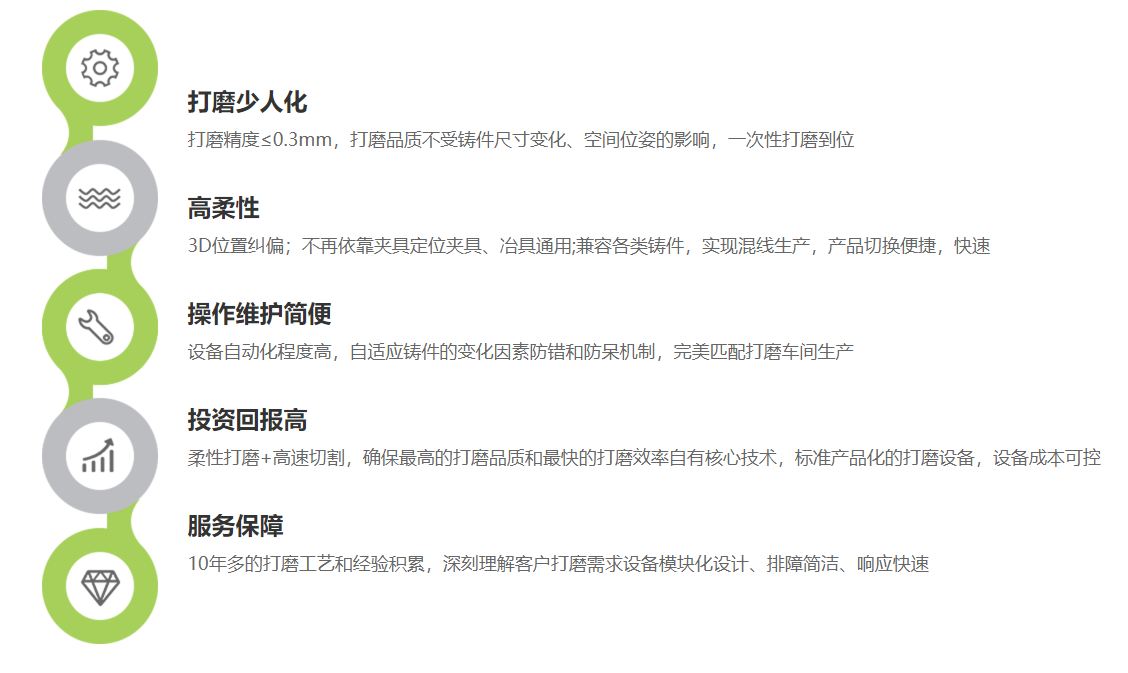 湖南全宇工业设备有限公司是一家专业从事机器人打磨的高科技公司,创始团队在过往10余年中始终专注于铸件打磨机器人的自动化研发和市场工作。全宇工业成立以来,凭借自身在铸件打磨行业中的技术优势和丰富的项目经验,迅速获得国内一线基金北极光创投投资。公司成立以来,成功实施4家国内外同行闲置设备的改造,并服务包括潍柴、中车、亚新科、中国航天等铸造各细分领域多个头部客户,在打磨质量、生产效率、多品种混线生产、可靠性以及交付保障等方面赢得客户高度认可。
