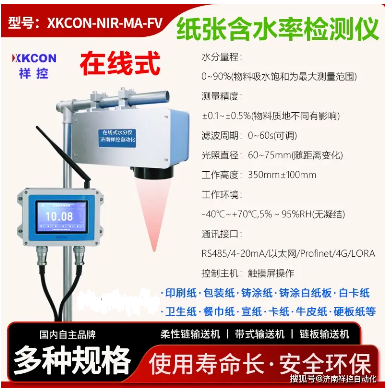 济南祥控自动化设备有限公司生产的XKCON-NIR-MA-FV型在线近红外水分仪采用光谱分析和近红外检测(NIR)技术,印刷纸、包装纸、铸涂纸、铸涂白纸板、白卡纸等50种纸张进行快速水分测定。