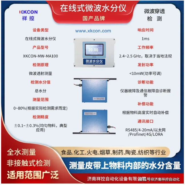 济南祥控自动化设备有限公司生产的XKCON-MW-MA100型在线式微波水分仪基于微波在物质中的传播特性与水分子对微波能量的吸收特性,能够对煤炭中的水分含量进行快速测量,广泛应用于火电、焦化、钢铁等行业。
