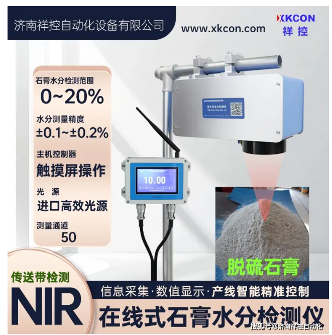 济南祥控自动化设备有限公司生产的近红外水分仪XKCON-NIR-MA-FV基于光学检测原理,采用近红外非接触式检测方式,可对火电厂内皮带输送机上运行的脱硫石膏粉进行快速、连续、在线测定和智能水分控制。