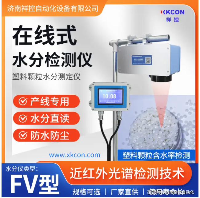 近年来,一种新型的水分检测技术——近红外光谱检测技术(NIR)被逐渐应用到塑料粒子含水量测定中,如济南祥控生产的XKCON-NIR-MA-FV型在线式水分仪就是基于近红外光谱检测技术(NIR)研制,已被应用在塑料造粒、改性、注塑成型、吹塑成型、滚塑成型、挤塑成型、压缩成型、压注成型、固相成型、挤拉成型、拉伸成型等塑料生产工艺中,对塑料粒子含水量进行快速、精准测定。