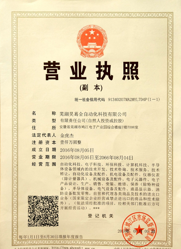 | 公司名称: | 芜湖昊葛金自动化科技有限公司 | 注册地址: | 安徽省芜湖市鸠江电子产业园综合楼座7楼7008室 |