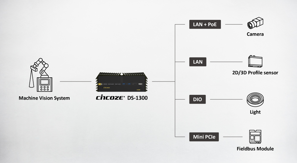 Cincoze的客户为欧洲知名机器视觉设备商,选用了DS-1300嵌入式工控机导入齐下多款机器视觉系统的核心。善用DS-1300优秀的运算能力与扩充性,实时处理来自摄影机与传感器的大量影像并进行精准辨识,不仅大幅提升检测速度与正确性,还能有效降低生产成本、强化整体竞争力。
