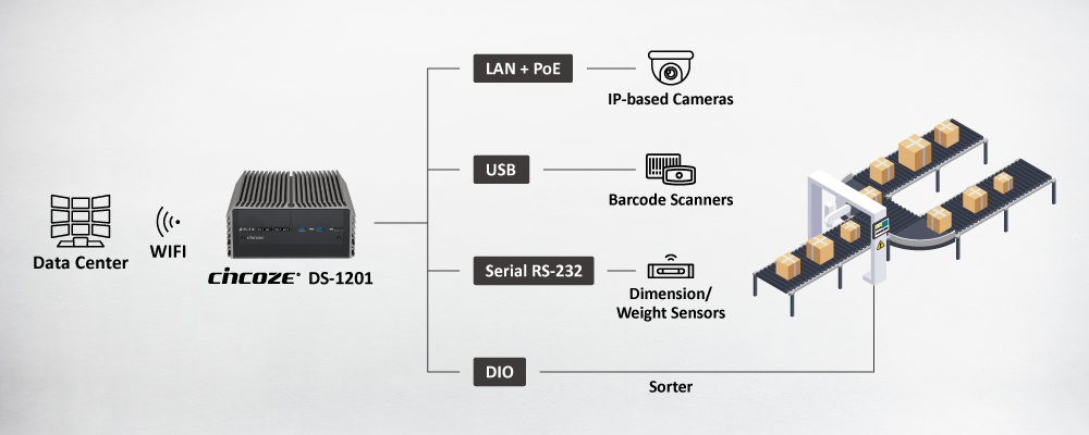 DS-1201具备强大的运算效能,搭载 Intel Core第9/8代处理器,可支持8核心与64GB DDR4 2666MHz内存,能稳定处理大量数据。嵌入式工控机的高运算效能可同时处理多组相机的影像、进行分拣路径计算、实时记录包裹追踪信息,并与场内的管理系统保持顺畅联网,不会因运算负担而产生延迟。实际应用中,DS-1201已于中小型分拣站在10个月内处理超过1,200万件包裹,同时也能支持大型区域中心每日超过50万件包裹的运作需求,并在旺季具备扩充到每日超过100万件的处理能力。多核心的设计让分拣流程运作更顺畅,也保留足够的效能空间,因应实时控制与高负载应用的需求。