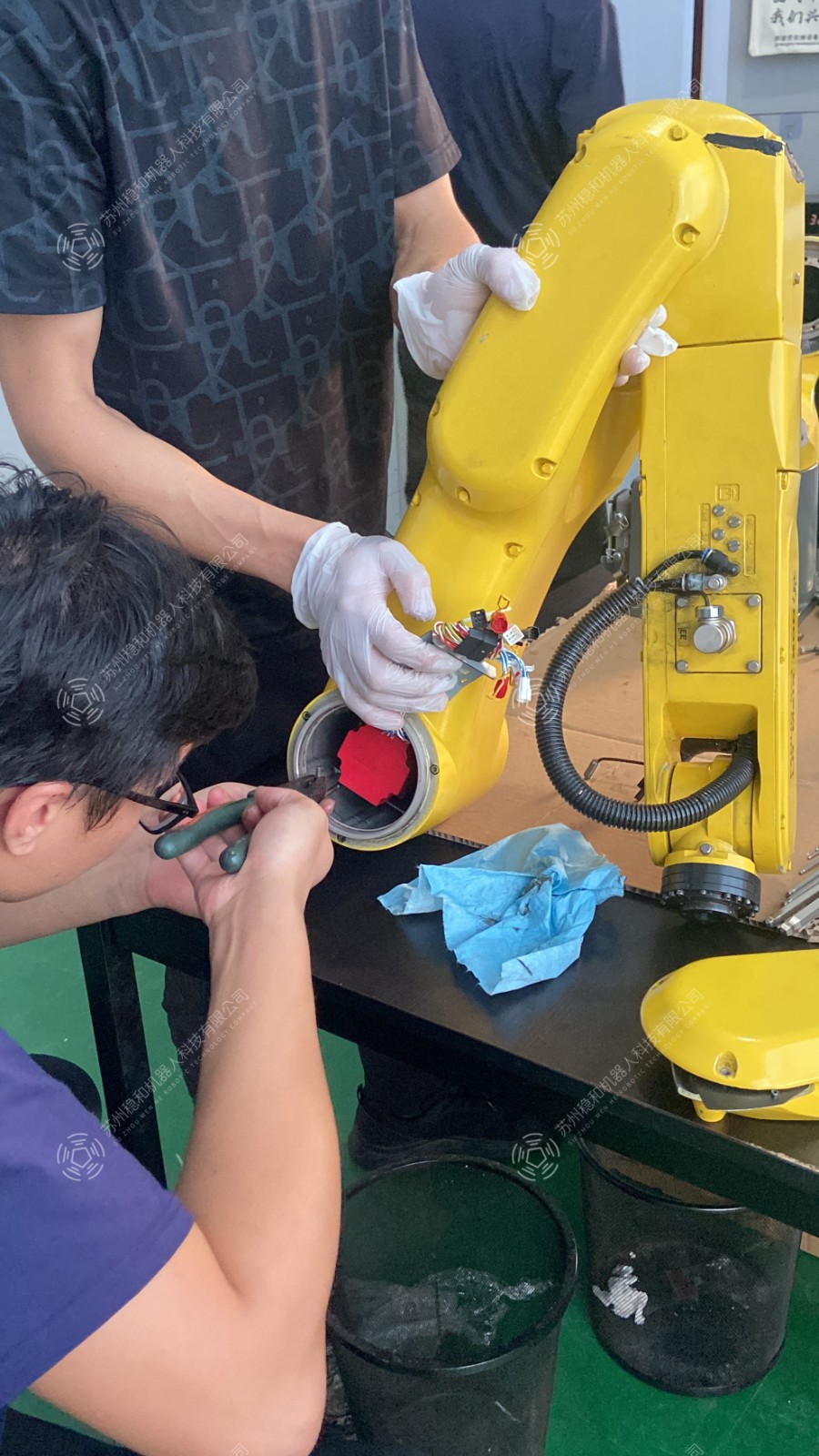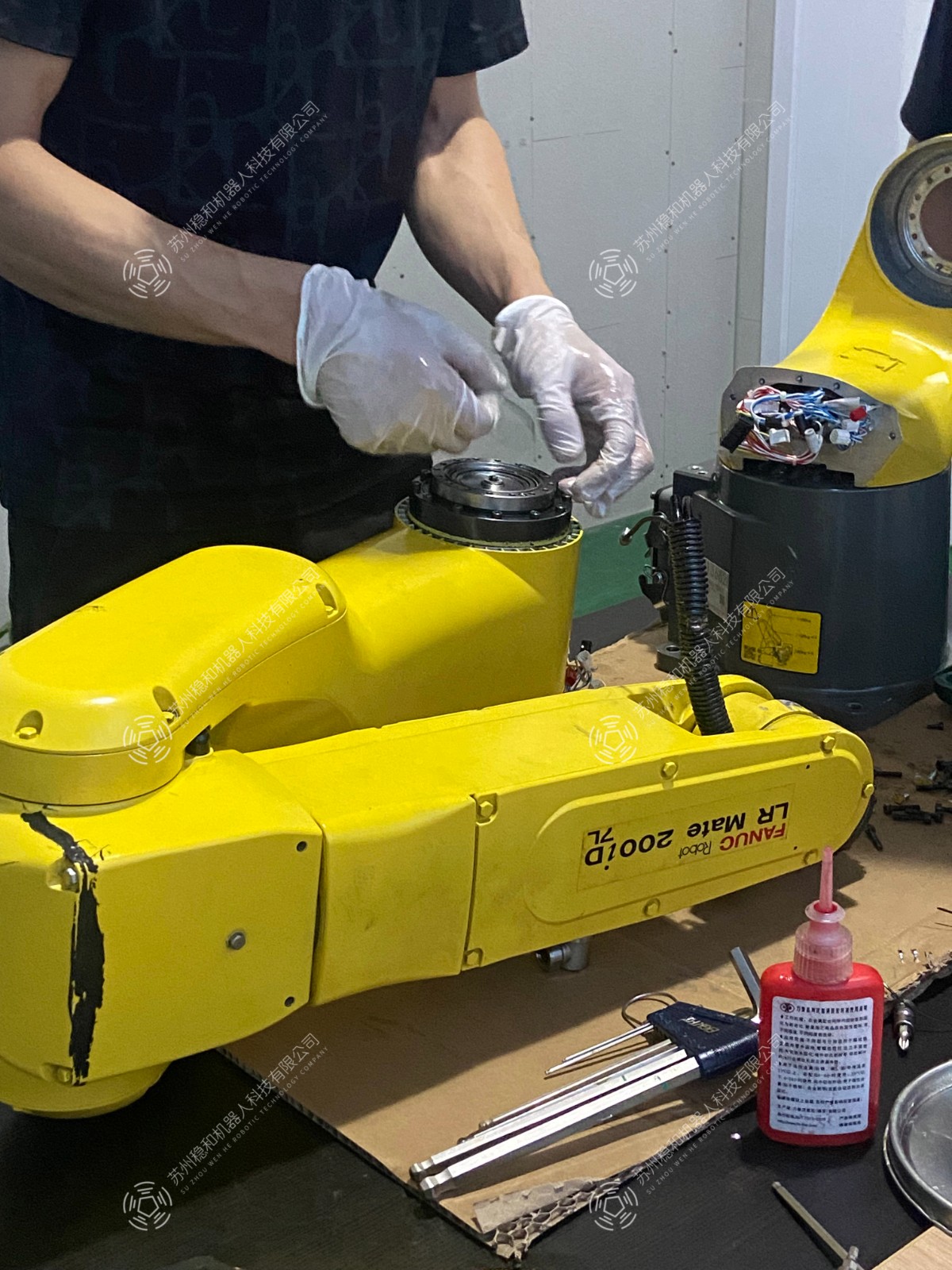 技术团队接到任务后,立即投入工作,严格遵循发那科机器人原厂维修规范,结合该型号机器人的结构特性,开展全面的故障排查。团队首先对机器人进行外观检查,确认机身无明显碰撞、损坏痕迹,随后重点对二轴减速机进行专项检测,通过听运行异响、测传动间隙、拆解检查内部部件等方式,精准定位故障根源:二轴减速机内部齿轮轻微磨损,轴承润滑不足,导致传动过程中产生摩擦异响,属于典型的常规磨损类故障,无需更换核心部件,通过专业清洁、润滑与调试即可彻底解决。