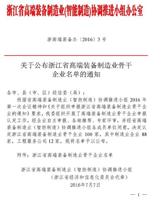根据省高端装备制造业(智能制造)协调推进小组2016年第一次会议精神和《关于组织申报浙江省高端装备制造业骨干企业的通知》要求,我委组织开展了高端装备制造业骨干企业申报认定工作,经企业自主申报、各地推荐、专家评审,并经省高端装备制造业(智能制造)协调推进小组各成员单位同意,厚达成为浙江省高端装备制造业骨干工程服务公司之一,此次入围充分说明了公司在智能制造领域的突出能力,同时也验证了公司作为“智能工厂整体解决方案专家”的技术核心价值。